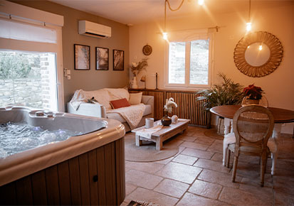 Salon, repas, télévision, poèle à bois et jacuzzi dans un cadre cosi pour se détendre.