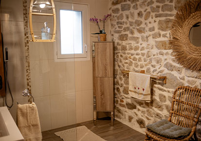 La pierre et le bois dominent dans cette salle d’eau spacieuse et parfaitement équipée.